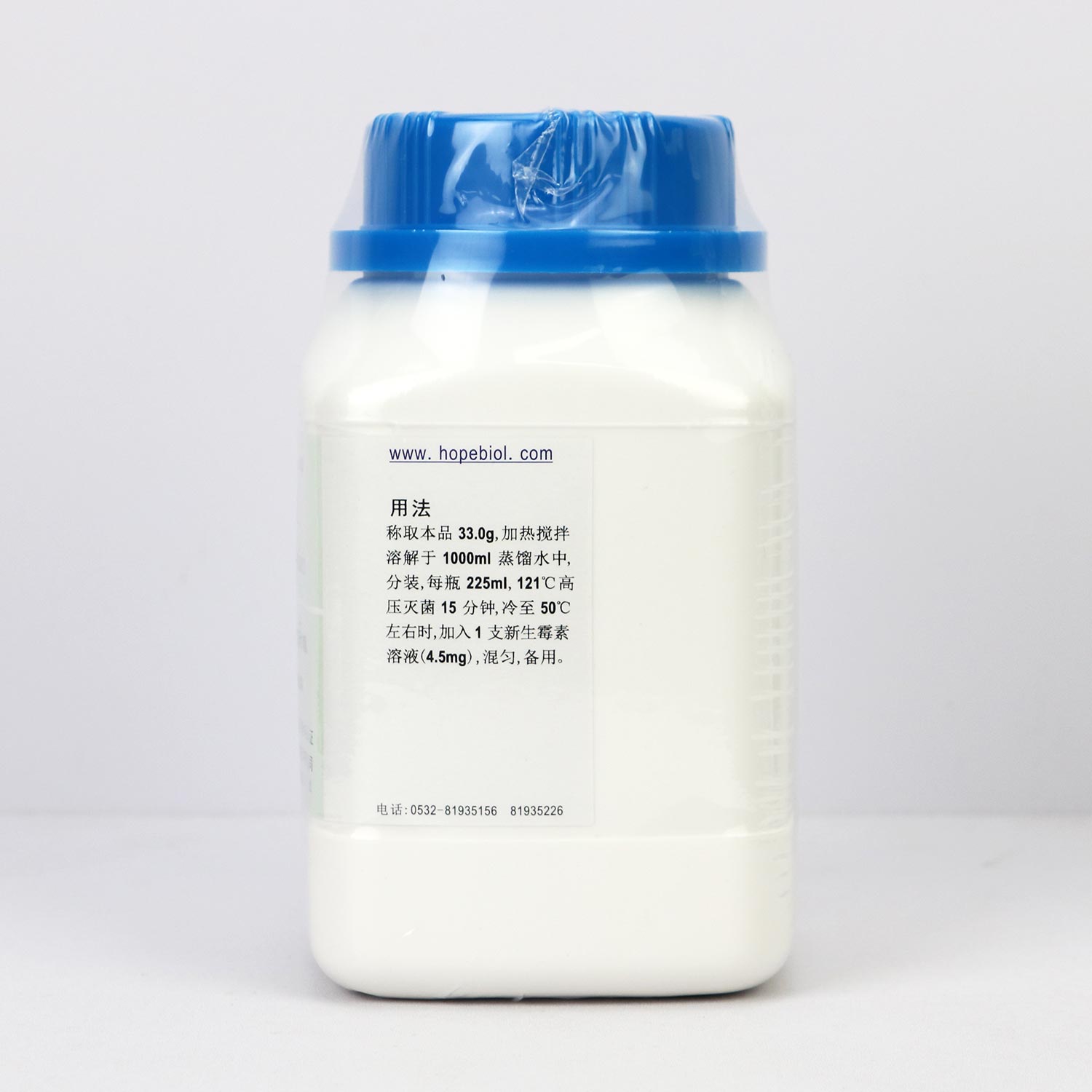 称取本品33.0g,加热搅拌溶解于1000ml蒸馏水中,分装,每瓶225ml,121℃高压灭菌15分钟,冷至50℃左右时,加入1支新生霉素溶液(4.5mg),混匀,备用。