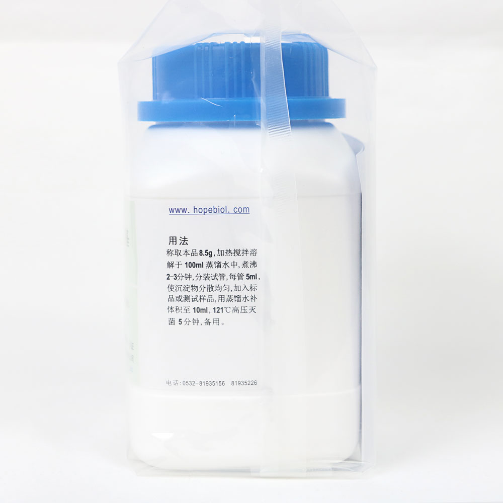 称取本品8.5g,加热搅拌溶解于100ml蒸馏水中,煮沸2-3分钟,分装试管,每管5ml,使沉淀物分散均匀,加入标准品或测试样品,用蒸馏水补体积至10ml,121℃高压灭菌5分钟,备用。