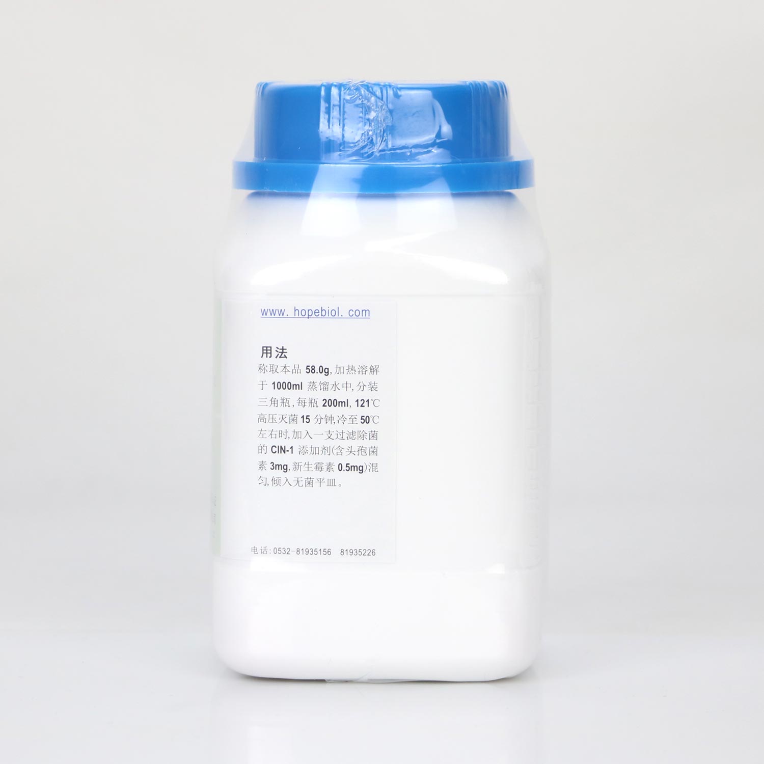 称取本品58.0g,加热溶解于1000ml蒸馏水中,分装三角瓶,每瓶200ml,121℃高压灭菌15分钟,冷至50℃左右时,加入一支过滤除菌的CIN-1添加剂(含头孢菌素3mg,新生霉素0.5mg),混匀,倾入无菌平皿。