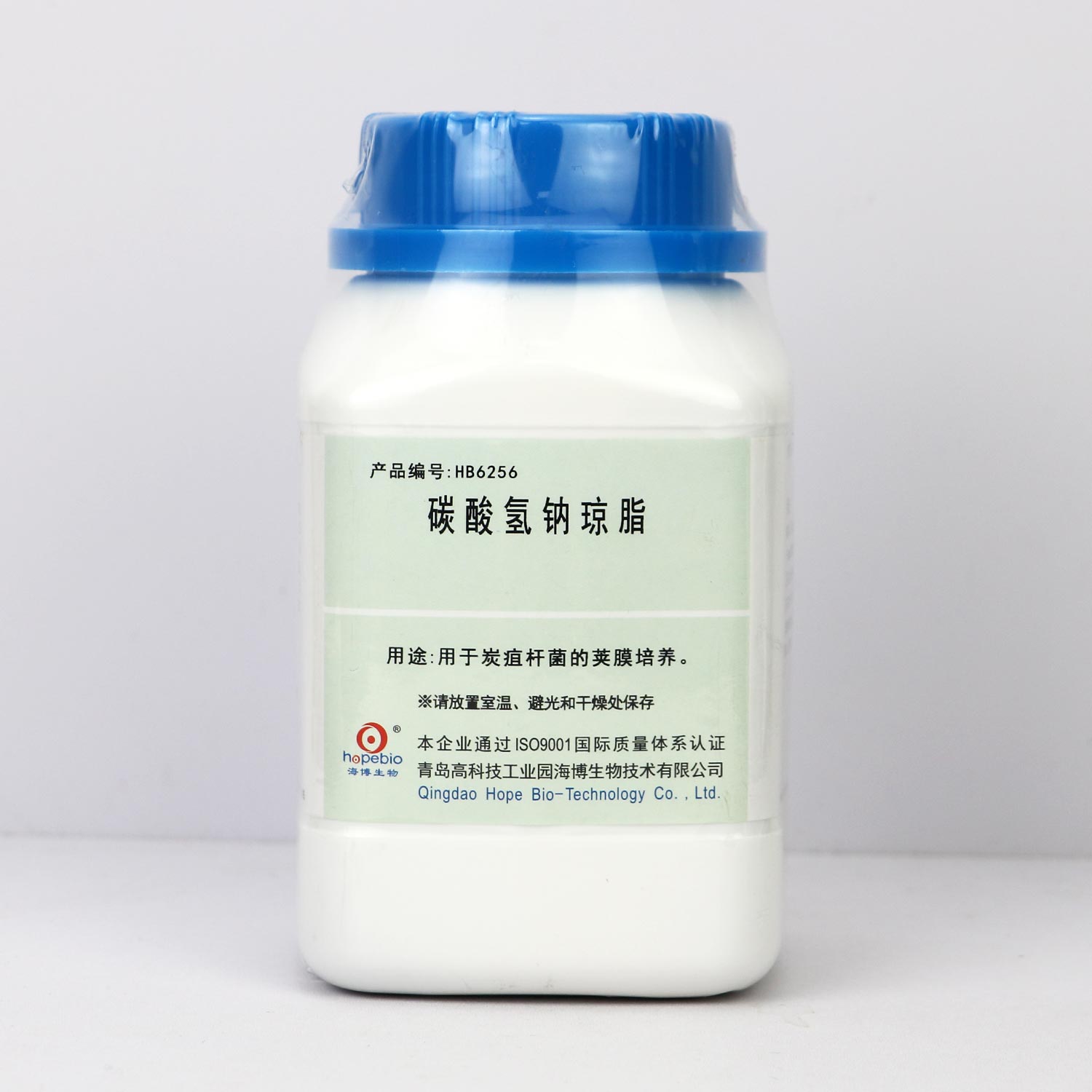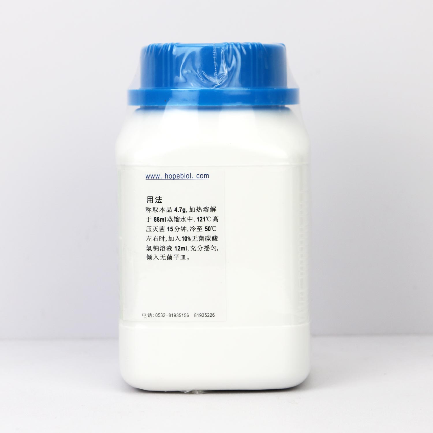 称取本品4.7g,加热溶解于88ml蒸馏水中,121℃高压灭菌15分钟,冷至50℃时,加入10%无菌碳酸氢钠溶液12ml,充分摇匀,倾入无菌平皿。