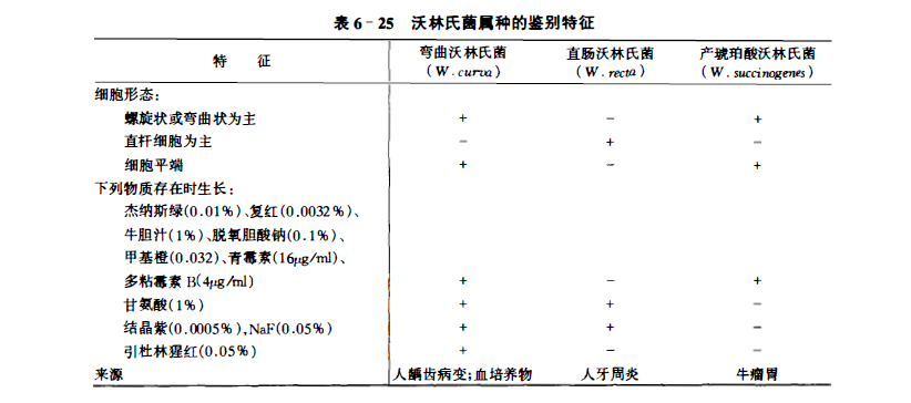 螺旋状、弯曲或直细胞,0.5~1.0μm X 2~6μm,菌体端圆或端平。不产芽孢。极生单鞭毛运动。尽管在Bergey系统细菌学手册中,沃林氏菌的种被描述为厌氧菌,但实际上他们是需H2或需甲酸的微好氧菌能够进行有氧呼吸。当其他的末端电子受体如延瑚索酸不存在时,它们则表现为利用低水平的氧进行需氧生长,而既不是厌氧生长也不是好氧生长。氧化酶阳性,接触酶阴性。含细胞色素。厌氧条件下依赖H2和延瑚索酸或甲酸和延瑚索酸生长,甲酸或H2被氧化为CO2,而延瑚索酸被还原为琥珀酸。不利用碳水化合物。分离于牛瘤胃、牙龈沟、牙根沟感染和其他临床标本。DNA的G+Cmol%是42~48。