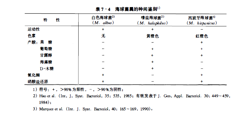 细胞球形,直径1.0~2.0μm,单个、成对或偶见四联。革兰氏阳性到革兰氏可变。以极少鞭毛运动。不生芽孢。好氧。呼吸代谢的化能异养菌。菌落光滑、凸起,具黄橙非水溶性色素。接触酶阳性。最适30~37℃。中等嗜盐,培养基需加0.5%~20%NaCl。发现于海和含盐的土壤中。种间鉴别见表7~4。