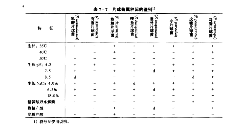 细胞球形永不延长,直径1.2~2.0μm。在适宜条件下,分裂以直二个方向形成四联,虽有时也可出现成对排列,单个细胞罕见,不形成链状。革兰氏阳性。不运动,不产芽孢。兼性厌氧,有的菌株在有氧时会抑制生长。化能异养,细胞需要丰富营养的培养基,发酵糖类(主要是单糖和双糖类)。葡萄糖产酸不产气,主要产物是DL或L (+)-乳酸盐。接触酶阴性,氧化酶也阴性。不还原硝酸盐。最适生长温度25~40℃。 出现于蔬菜和食品;对植物或动物不致病,种间鉴别见表7~7。
