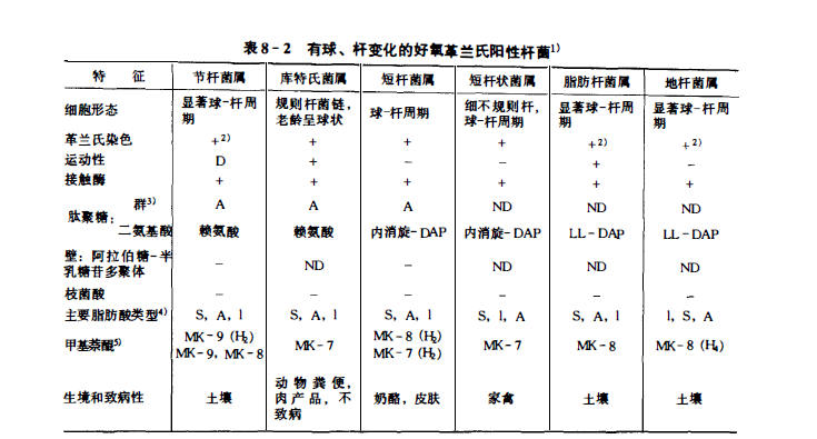 幼龄培养物的细胞呈不规则杆状,0.5~1.2μm X 1.0~7.0μm,大多数为单生,常出现分支状,老培养物含有类球状细胞。显著的杆-球周期变化的代表是脂肪杆菌属(Pimelobacter)和节杆菌属(Arthrobacter)。革兰氏阳性;老培养物很易褪色。细胞可以周生鞭毛运动。不产芽孢。不抗酸。好氧细胞产生光滑白色或黄白色菌落。化能异养菌,除肿胀脂肪杆菌(P.tumescens)需要维生素Bl之外,营养要求不苛求。呼吸代一谢,在蛋白胨基础培养基中,除葡萄糖可作为惟一碳源外,其他糖类一概不产酸。最适。生长温度25~30℃。接触酶阳性。通常液化明胶,可还原硝酸盐到亚硝酸盐。广泛分布于土壤。有显著球杆周期形态包括6个属,它们的鉴别见表8~2。种间鉴别见8~3。