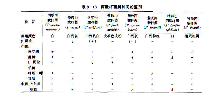 多形态杆菌,0.5~0.8μm X 1~5μm,常为圆端或尖端的棒状;有的细胞为类球状、分叉或分枝,但不成丝状。细胞单个、成对或短链,呈V或Y字形出现,或方形排列。革兰氏阳性,不运动,不生孢。兼性厌氧,有不同程度的耐氧性;大多数菌株可在稍缺氧的空气中生长,在血琼脂上的菌落通常凸起,半透明,有光泽,呈乳到带红色。化能异养菌,需复杂营养,发酵代谢,从葡萄糖和其他碳水化合物产大量的丙酸和乙酸,常有少量的气体。最适生长温度30~37℃。通常接触酶阳性,主要发现于乳酪、乳制品和人的皮肤。与棒状杆菌及梭菌某些种很易混淆。种间的鉴别见表8~13。