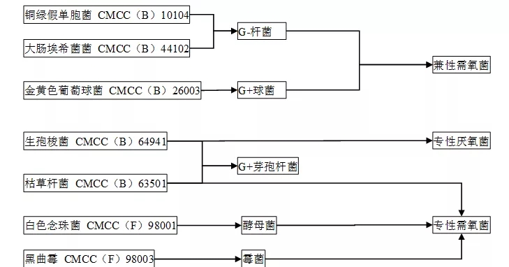 培养基接种:取适宜装量的硫乙醇酸盐流体培养基7支,分别接种不大于l00cfu的金黄色葡萄球菌、铜绿假单胞菌、生抱梭菌各2支,另1支不接种作为空白对照;取适宜装量的胰酪大豆陈液体培养基7支,分别接种不大于100cfu的枯草芽抱杆菌、白色念珠菌、黑曲霉各2支,另1支不接种作为空白对照。接种细菌的培养管培养时间不超过3天,接种真菌的培养管培养时间不得超过5天。逐日观察结果。