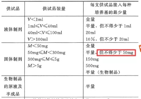 注意:表3中,对于固体制剂,供试品装量在50mg≤M<300mg的范围时,“每支供试品接入每种培养基的最少量”为:半量,但不得少于50mg。