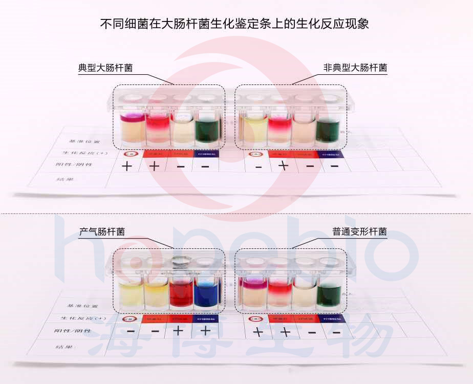 注意事项:本产品仅用于测定大肠杆菌的IMViC试验,不能仅凭此鉴定条确证是否为大肠杆菌,必须同时结合乳糖发酵试验和革兰氏染色,可判断是否为大肠杆菌(如普通变形杆菌,IMViC试验结果虽与大肠杆菌相同,但乳糖发酵试验为阴性,以此进行排除)。