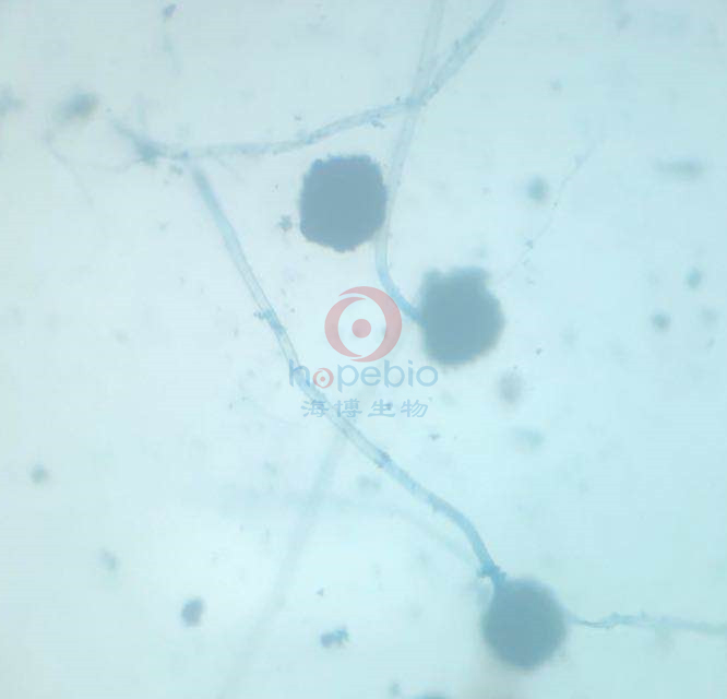 酵母菌细胞、菌丝体和产孢结构等皆可被染成亮蓝色;背景为暗淡的蓝色。