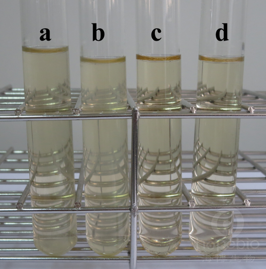 a:金黄色葡萄球菌(ATCC25923),b:金黄色葡萄球菌(ATCC6538),c:大肠埃希氏菌,d:空白对照