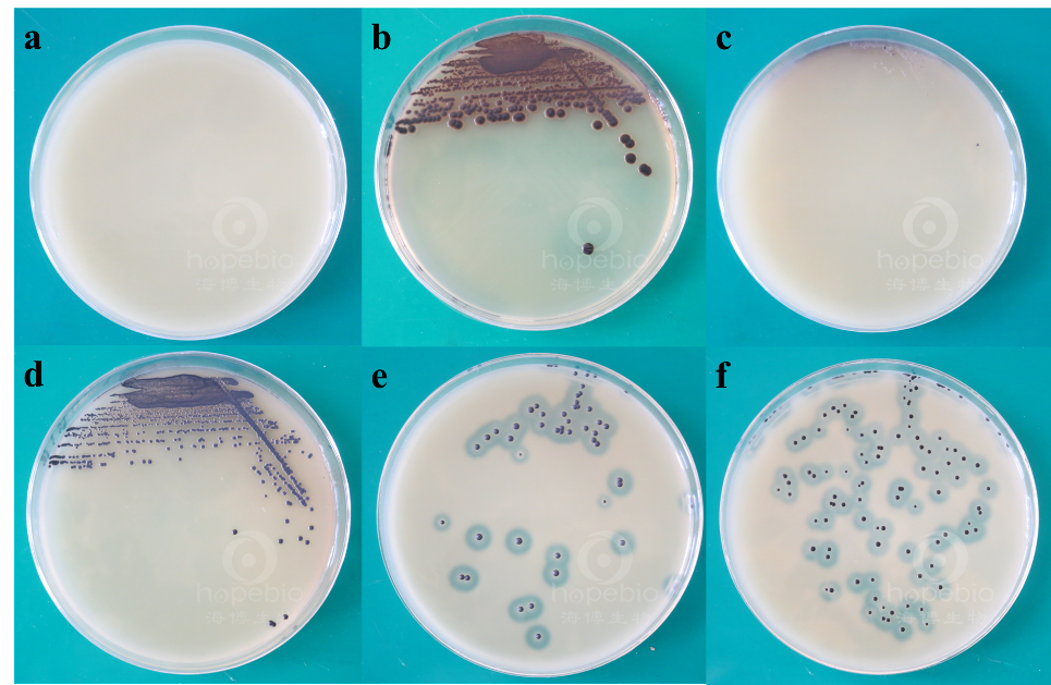 表面光滑、凸起、湿润、菌落直径为2mm-3mm,颜色呈灰黑色至黑色,有光泽,常有浅色(非白色)边缘,周围绕以不透明圈(沉淀),其外常有一清晰带,用接种针触及菌落时有黄油样黏稠感,见图1-3-1e、1-3-1f。有时可见到不分解脂肪的菌株,除没有不透明圈和清晰带外,其他外观基本相同。从长期贮存的冷冻或脱水食品中分离的菌落,其灰色常较典型菌落浅些。且外观可能较粗糙,质地较干燥。