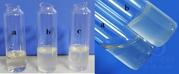 取新鲜配置兔血浆0.5mL,放入小试管中再加入BHI培养物0.2mL-0.3mL,振荡摇匀,置于36℃± 1℃温箱或水浴箱内,每半小时观察一次,观察6h,如果凝固(即将试管倾斜或倒置时,呈现凝块)或凝固体积大于原体积的一半,被判为阳性结果,见图1-4-2。同时以血浆凝固酶试验阳性和阴性葡萄球菌菌株的肉汤培养物作为对照。如结果可疑,挑取斜面上的菌落到5mLBHI,36℃± 1℃培养18-48h,重复试验。