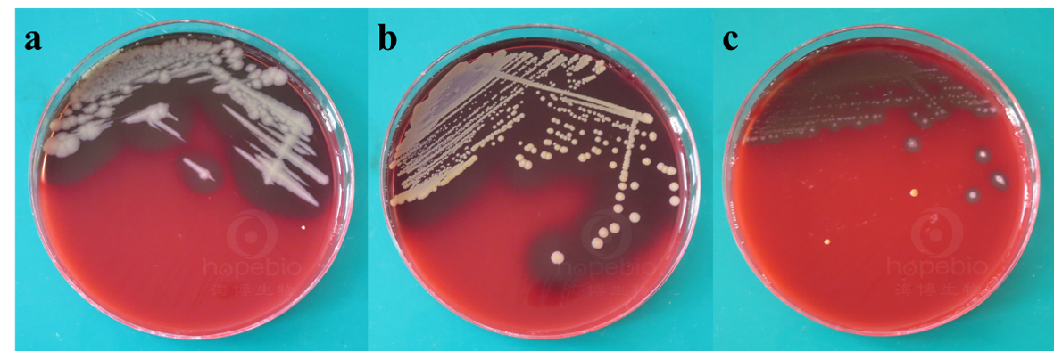a:蜡样芽孢杆菌,b:金黄色葡萄球菌,c:乙型溶血性链球菌