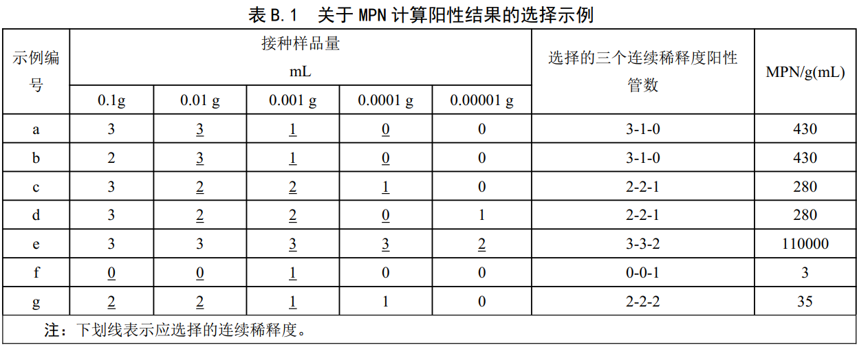 a)有一个以上的稀释度3管均为阳性。选择三管都是阳性结果的最高稀释度及其相连的两个更高稀释度(见表B.1示例a、b,表中带下划线的数字对应的接种样品量为最终选取的最适稀释度,下同);