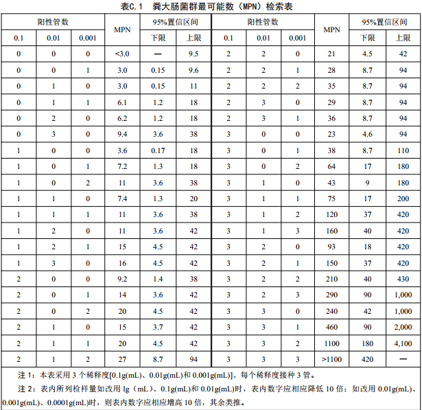 每g(mL)检样中粪大肠菌群最可能数(MPN)的检索见表C.1
