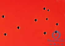 多数沙门氏菌可产硫化氢,不分解乳糖和蔗糖,在XLD平板上菌落呈现无色或红色,有黑色中心(如图鼠伤寒沙门氏菌)。部分沙门氏菌可分解XLD培养基中的少量木糖产酸,赖氨酸脱羧反应迟缓,培养早期可观察到菌落周围略微偏黄(如图肠炎沙门氏菌),培养后期分解赖氨酸产碱可使菌落周围变回红色。一些产硫化氢的其他菌属可在此培养基上生长,菌落有黑色中心,为常见干扰菌。
