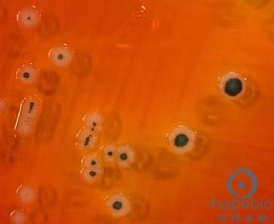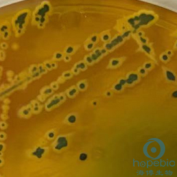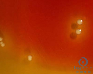 培养基简介:XLD培养基中含有铁盐和硫酸盐,产硫化氢的细菌可还原硫酸盐生成硫化氢,与铁盐反应生成黑色物质,使菌落带有黑色中心;培养基中含有少量的木糖及较多的蔗糖和乳糖用于细菌糖代谢初步判断,不能发酵乳糖或蔗糖的细菌通常呈无色或红色,能发酵乳糖或蔗糖的细菌呈黄色。