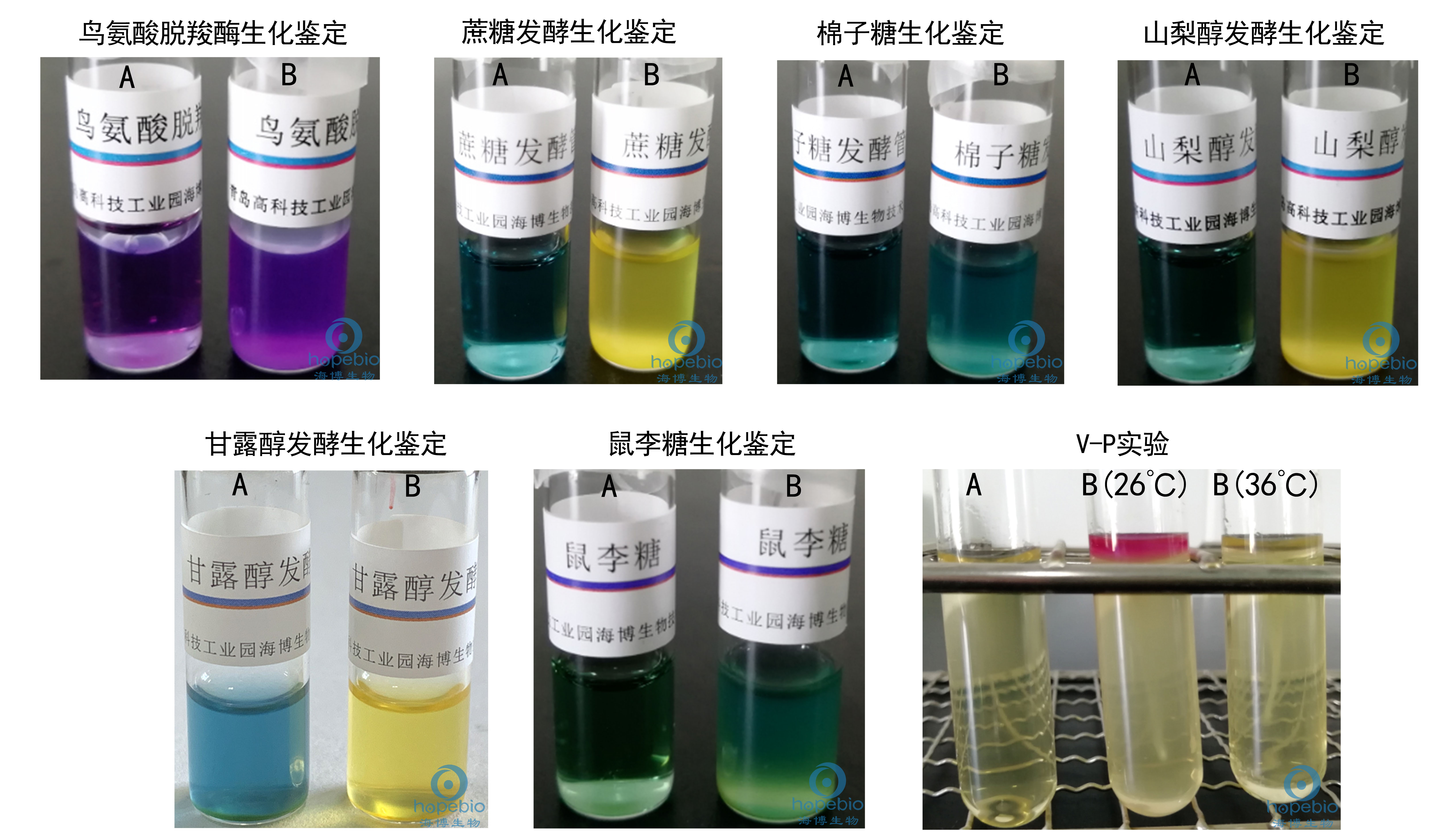 使用海博生化管进行生化鉴定,小肠耶尔森氏菌生化反应结果为鸟氨酸脱羧酶阳性、蔗糖阳性、棉子糖阴性、山梨醇阳性、甘露醇阳性、鼠李糖阴性和V-P试验阳性(26℃)。如图5所示: