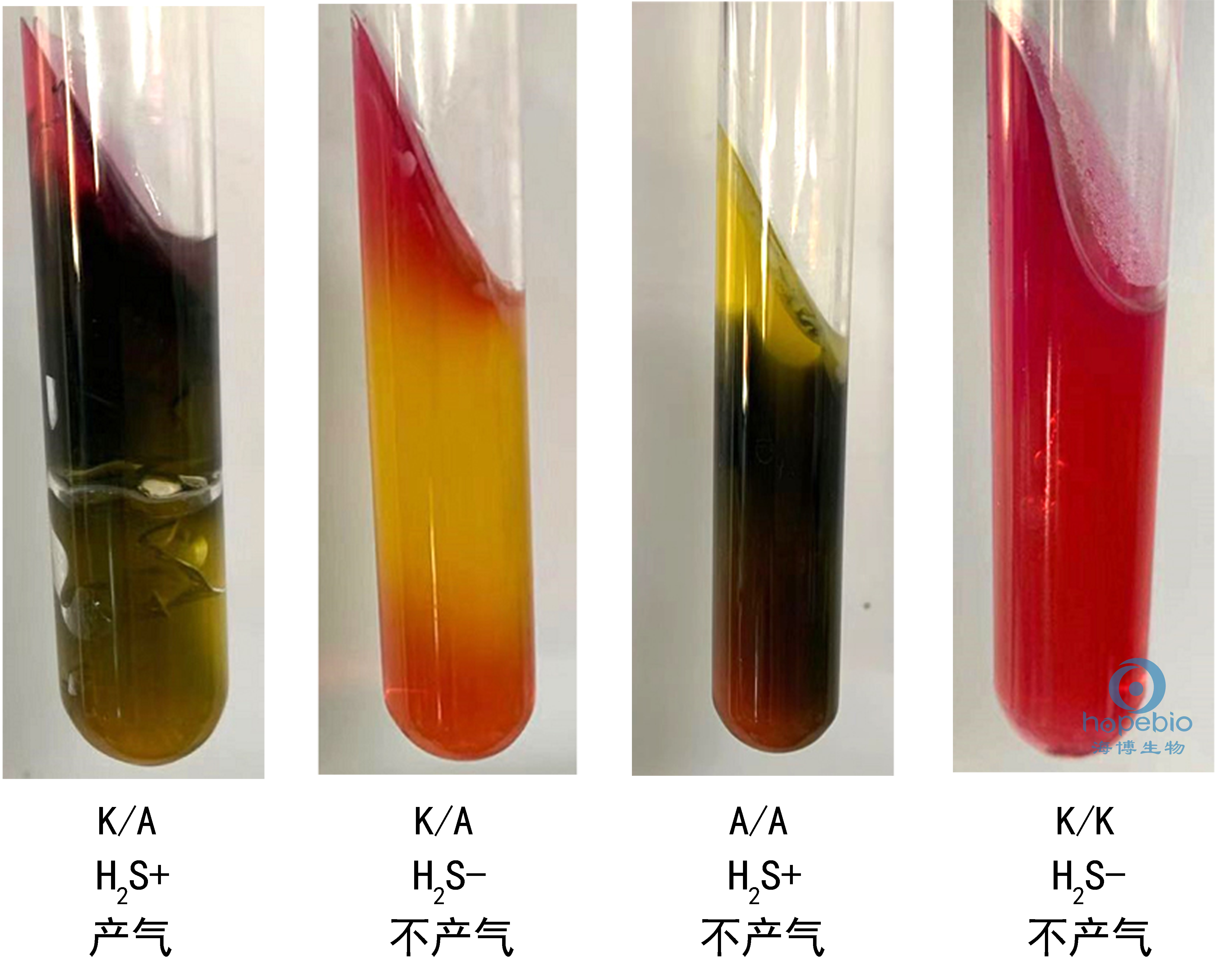 大多数沙门氏菌在三糖铁上的反应为K/A,产气,底层变黑有硫化氢产生;少数不产硫化氢的沙门氏菌在三糖铁上的反应为K/A,产气,底层无黑色出现;极少数分解乳糖的沙门氏菌在三糖铁上的反应为A/A,产气,底层变黑有硫化氢产生。