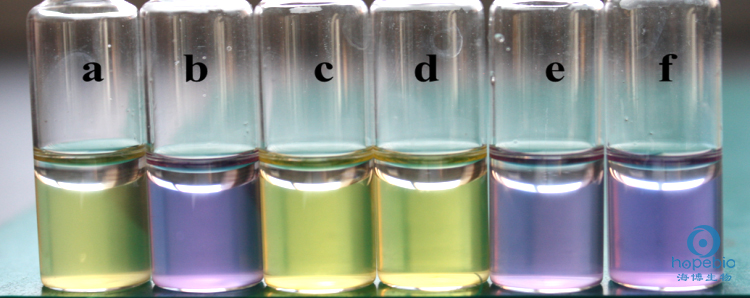 b、e、f:赖氨酸脱羧酶阳性反应,紫色;a、c、d:赖氨酸脱羧酶阴性反应,黄色
