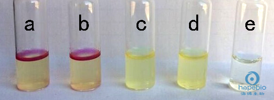 a、b:靛基质阳性反应,有玫红色环;c、d:靛基质阴性反应,有黄色环;e:空白对照
