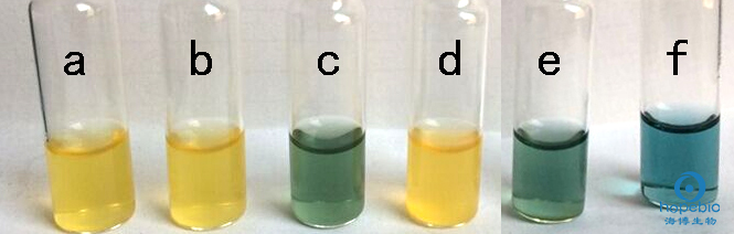 a、b、d:糖醇发酵阳性,变黄;c、e:阴性反应,仍为蓝绿色 |