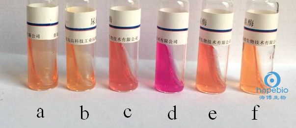 a、b、c、e:尿素酶阴性反应,变黄或橙红色;d:尿素酶阳性反应,变玫红色。