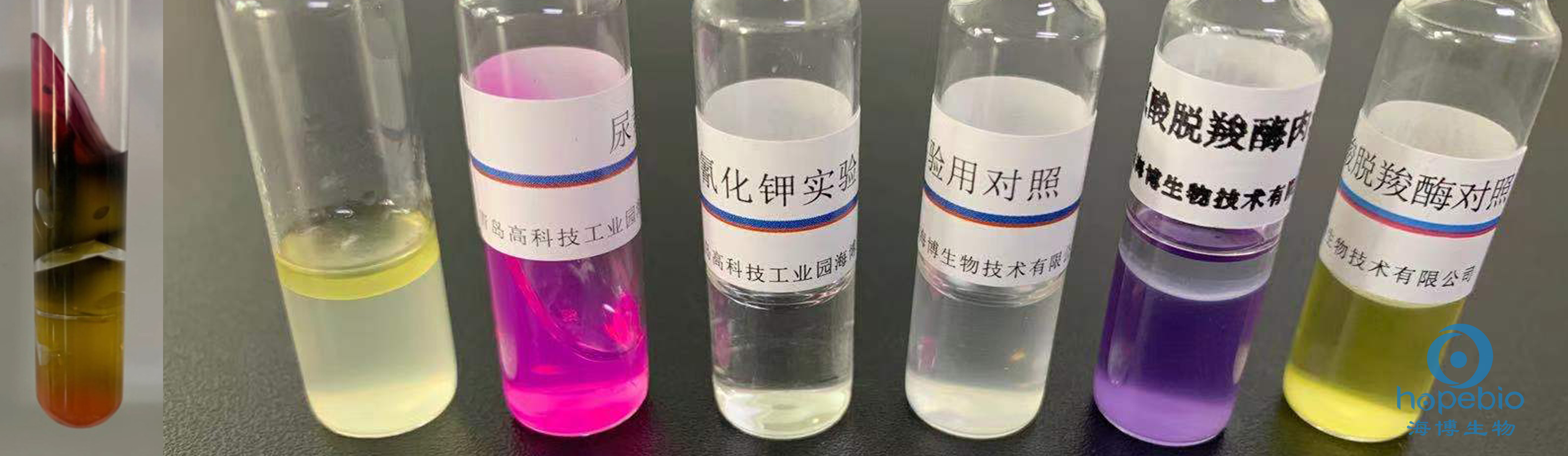 此反应必须同时接种氨基酸脱羧酶对照生化管,细菌进行赖氨酸脱羧酶反应时,首先分解培养基中的葡萄糖产酸使培养基变成黄色,然后再分解赖氨酸脱羧产碱,使培养基又变回紫色。因此,当氨基酸脱羧酶对照管变成黄色,赖氨酸脱羧酶生化管紫色时,即为赖氨酸脱羧酶反应阳性;当氨基酸脱羧酶对照管盒赖氨酸脱羧酶生化管均为黄色时,即为赖氨酸脱羧酶反应阴性。