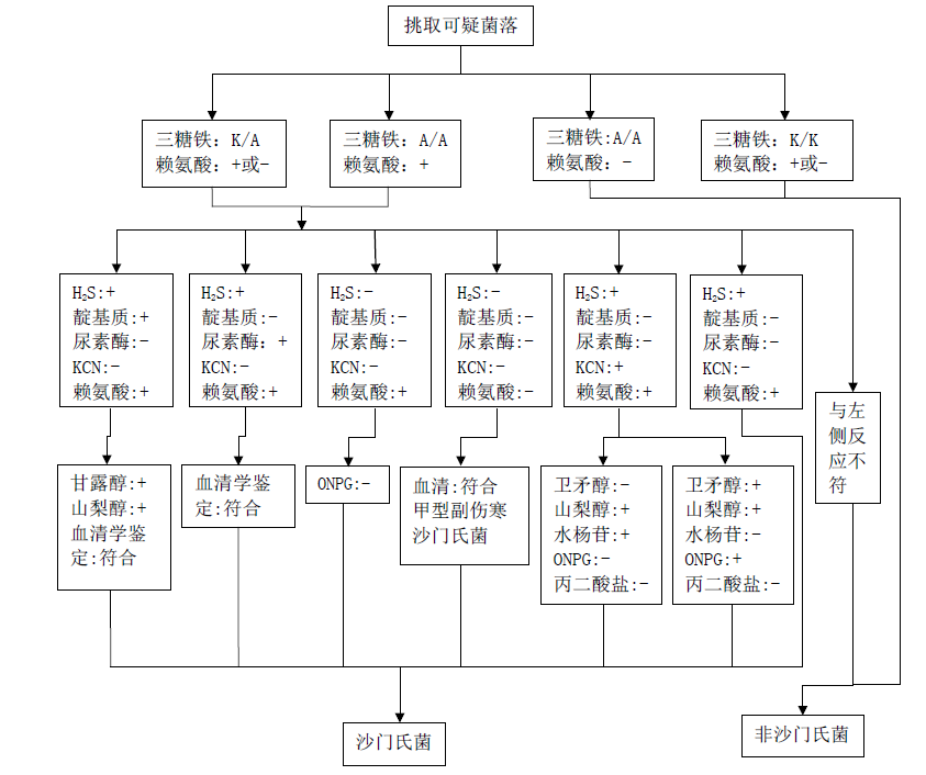 (3.5)若出现以下生化反应(硫化氢阴性,同时赖氨酸脱羧酶阴性),有可能为甲型副伤寒沙门氏菌,需做血清学试验。若血清学试验符合甲型副伤寒沙门氏菌特征,可确认为甲型副伤寒沙门菌。