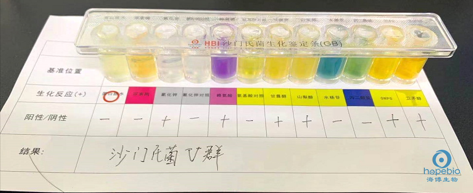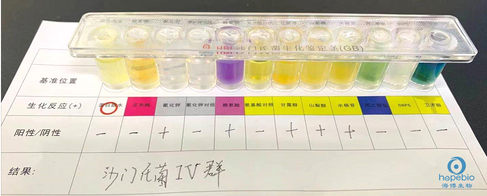 沙门氏菌IV群在HBI沙门氏菌生化鉴定条上的反应结果:靛基质-,尿素酶-,KCN+,KCN对照浑浊,赖氨酸+,氨基酸脱羧酶对照变黄,甘露醇+,山梨醇+,水杨苷+,丙二酸盐-,ONPG-,卫矛醇-。