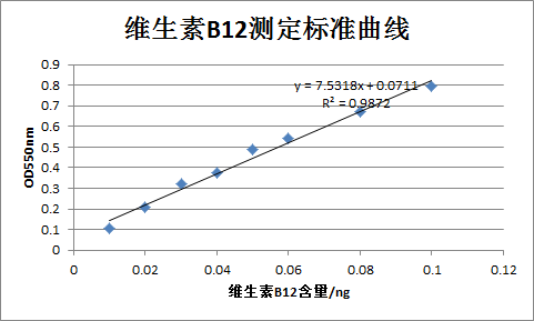 在测定用培养基中供给除维生素B12以外的所有营养成分,这样莱士曼乳杆菌生长浓度(吸光度)就会同标准曲线工作液及未知待测溶液中维生素B12的含量呈正比的线性关系。以不同浓度标准溶液的维生素B12含量为横轴,以莱士曼乳杆菌生长浓度(吸光度)为纵轴,即可绘制标准曲线,根据标准曲线即可计算出试样中维生素B12的含量。