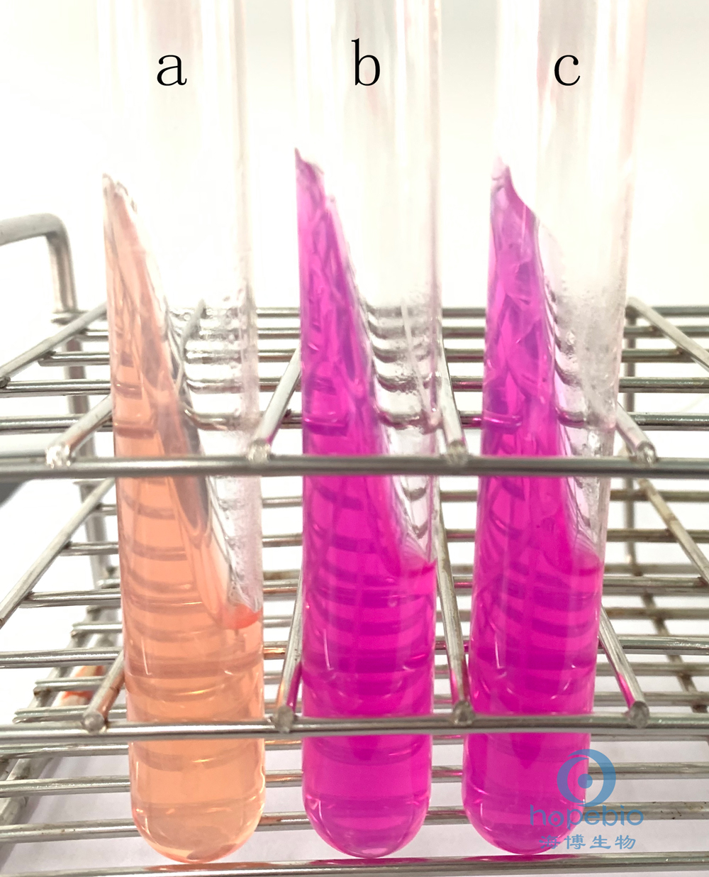 挑取SS平板上的可疑菌落,穿刺接种尿素琼脂斜面,接种时先在斜面划线,然后再穿刺到底层放入培养箱36℃±1℃培养18-24h,普通变形杆菌和奇异变形杆菌的试验现象为尿素培养基变玫红,如图4所示: