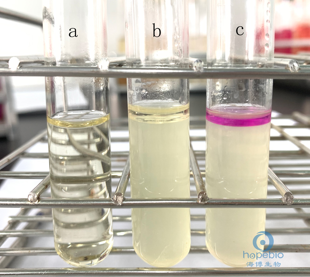 将菌接种于胰蛋白水培养基中,放入培养箱36℃±1℃培养18-24h,滴加Kovacs氏靛基质试剂,立即观察反应结果。普通变形杆菌为玫红色环,为阳性;奇异变形杆菌为黄色环,为阴性,如图6所示: