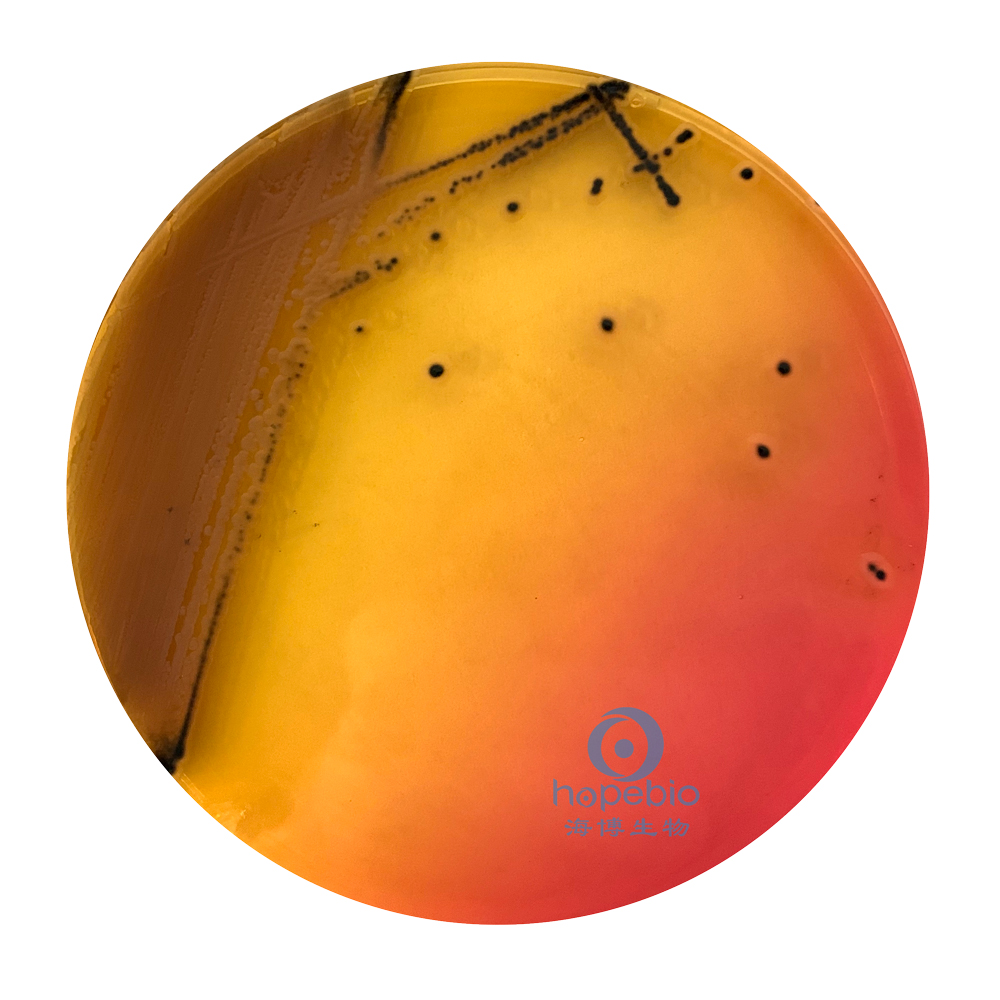 取增菌液1环,划线接种于SS平板上,于36℃±1℃培养18-24h,普通变形杆菌和奇异变形杆菌在SS平板上的典型菌落为:1mm-2mm大小、无色半透明或有黑色中心,边缘整齐,表面光滑的圆形菌落,如下图所示: