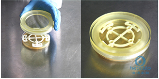 4、在平板中放置牛津杯。用无菌镊子夹住HB四连式牛津杯正面的凸点,将其放置在菌层培养基表面上,如图1;将压杯板盖上,压住牛津杯5秒左右,使4个小杯与培养基表面紧密接触,防止出现缝隙导致漏液,然后小心拿走压杯板。如图2。