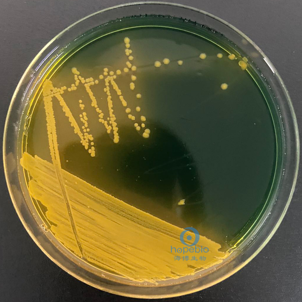 原理:蛋白胨、酵母浸粉提供碳氮源、维生素和生长因子;氯化钠可刺激弧菌的生长;蔗糖是可发酵的糖类;牛胆酸钠、牛胆粉、硫代硫酸钠和枸橼酸钠及较高的pH 可抑制革兰氏阳性菌和大肠菌群;硫代硫酸钠与柠檬酸铁反应作为检测硫化氢产生的指示剂;溴麝香草酚蓝和麝香草酚蓝是pH指示剂;琼脂是培养基的凝固剂。