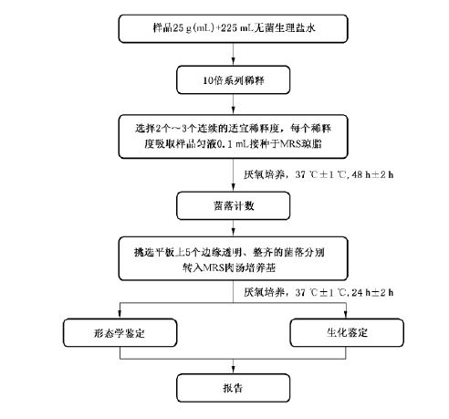 挑选平板上5个边缘透明、整齐的菌落分别转入MRS肉汤培养基37±1℃厌氧培养箱中培养24h±2h后进行形态学、生化鉴定。