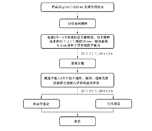 挑选平板上5个白色不透明、湿润、边缘光滑的菌落分别转入营养肉汤培养基37℃±1℃厌氧培养箱中培养24h±2h后进行形态学、生化鉴定。