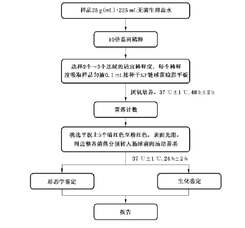 根据对待检样品菌含量的估计,选择2个~3个连续的适宜稀释度﹐每个稀释度吸取样品匀液0.1mL接种于KF链球菌琼脂平板内,使用涂布棒尽可能小心快速地涂布接种液于琼脂表面,涂布棒不得接触平皿边缘。每个稀释度接种2个平板。涂布后,将平板静置10 min使接种物完全被培养基吸收。翻转平皿置于37℃±1℃厌氧培养箱中培养48h±2h。
