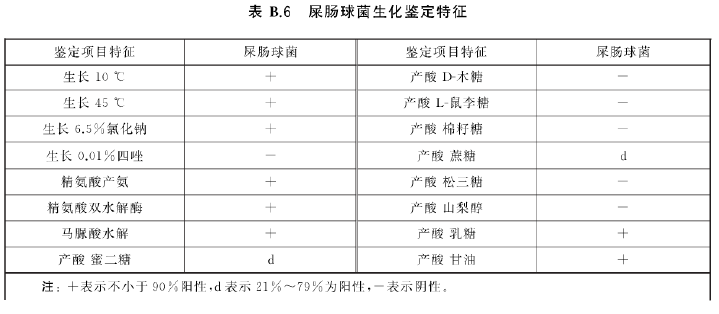 使用细菌生化鉴定试剂盒进行生化鉴定。鉴别特征参见表B.6。肠球菌属常见菌种主要鉴定特征见表C.2。