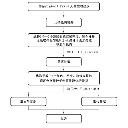 挑选平板上5个红色、平滑、边缘齐整的菌落分别转入麦芽汁液体培养基28℃±1℃培养箱中培养24h-48h后进行形态学、生化鉴定。
