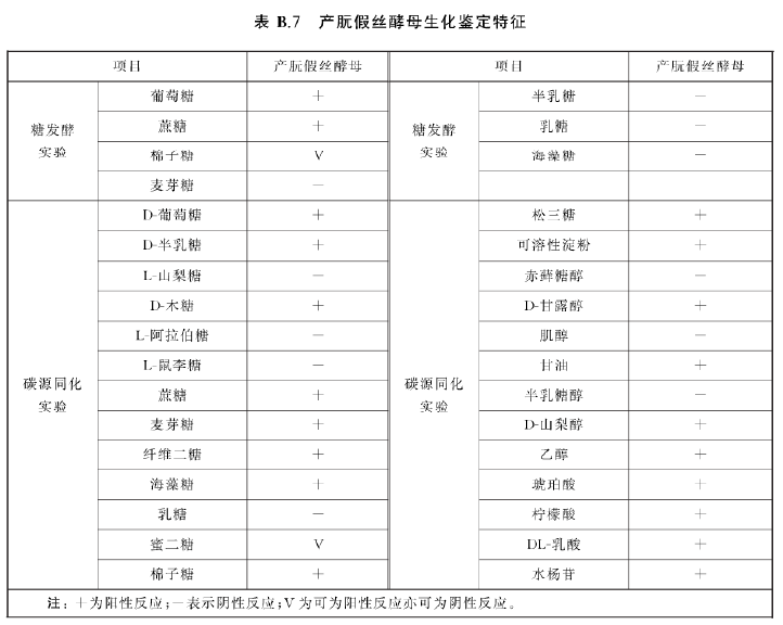 使用酵母菌生化鉴定试剂盒进行生化鉴定。鉴别特征参见表B.7。