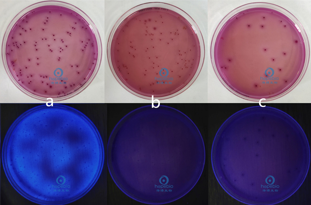 注意事项:选择菌落数在10~100CFU之间的平板,暗室中360~366nm波长紫外灯照射下,计数平板上发浅蓝色荧光的菌落。