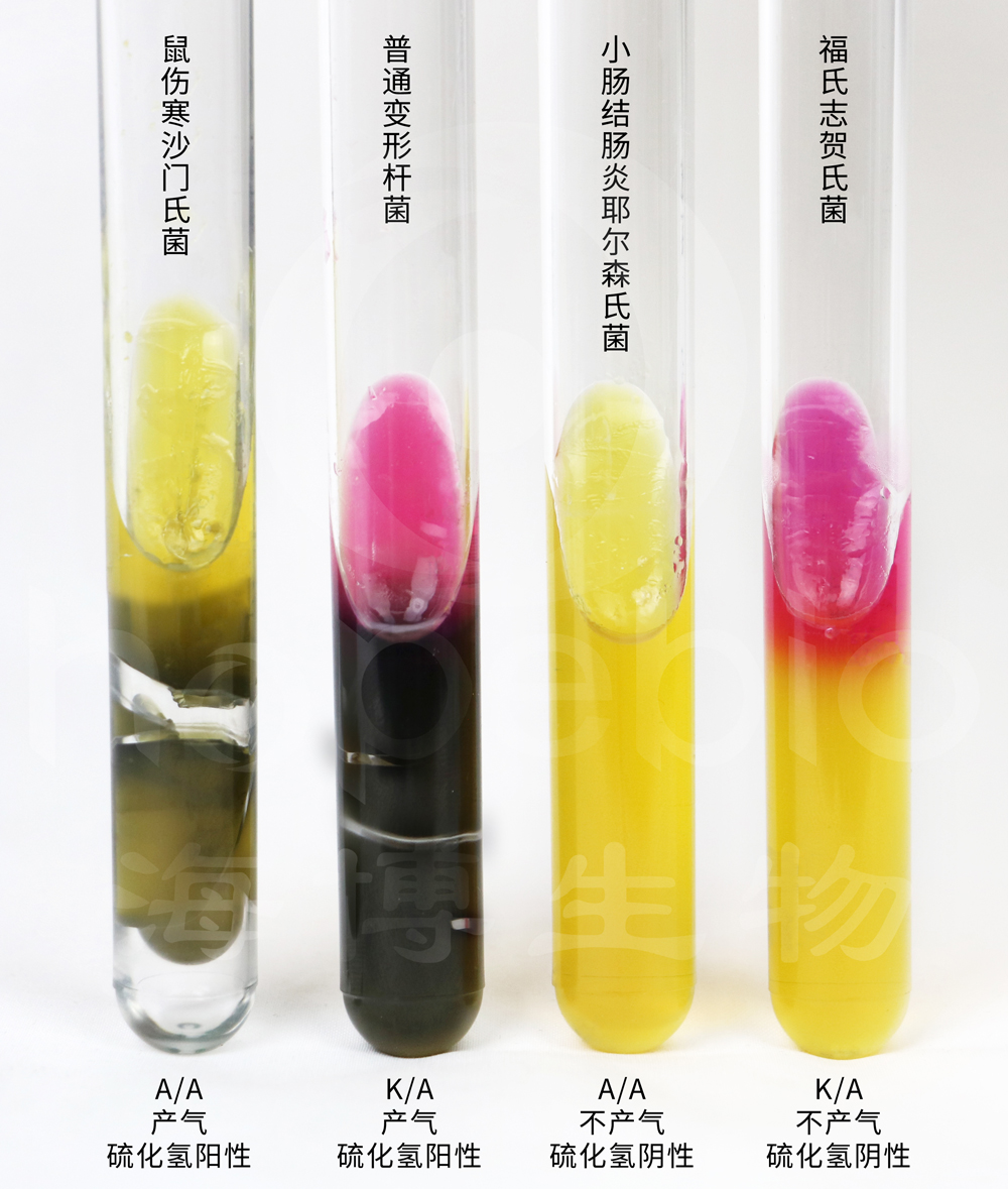 培养基中含有少量的葡萄糖(1g/L)和较多的山梨醇(20g/L)两种碳源,若细菌仅能发酵葡萄糖而不能发酵山梨醇,在培养基中产酸较少,在斜面处的酸受空气氧化生成碱性物质,pH较高显红色,底层少量酸不被氧化,pH下降显黄色;若细菌能发酵山梨醇,在培养基中产生大量酸,整个培养基pH下降,斜面和底层均显黄色。若细菌仅能氧化利用葡萄糖或不能利用葡萄糖,则培养基斜面和底层均为红色。若细菌分解葡萄糖或山梨醇产气,可观察到气泡或断层现象。产硫化氢细菌可还原硫代硫酸钠、硫酸亚铁生成硫化氢,与培养基中亚铁离子反应生成黑色的硫化亚铁,可观察到底层变黑。
