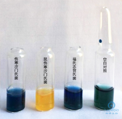 此培养基内的糖醇类仅有卫矛醇,若细菌能发酵卫矛醇,则产酸使培养基pH下降,指示剂颜色变黄;若不能发酵卫矛醇,则溶液颜色不变。若细菌有动力,则在生化管内扩散生长;若细菌无动力,则沿穿刺线生长。