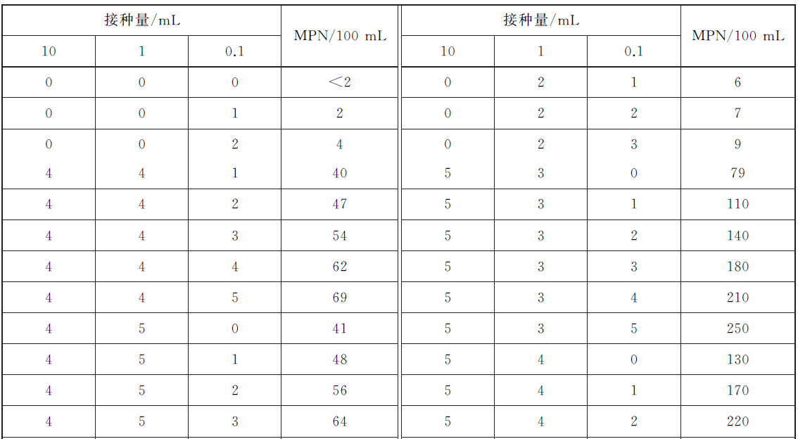 如水样含菌量少,也可按100mL、10mL、1mL接种,那么其实际MPN值应为表中的MPN值除以10;反之如含菌量较多,也可接种1mL、0.1mL、0.01mL,其实际MPN值应为表中的MPN值乘以10,余此类推。
