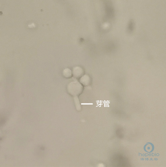白色念珠菌又叫白色假丝酵母菌,为条件致病菌,是一种双相真菌,正常情况下一般为酵母相,菌体呈圆形或卵圆形,致病时表现为菌丝相,菌丝是菌体获取营养的重要方式,而芽管有助于菌体更加牢固的附着于人体组织。在正常使用SDA培养白色念珠菌时,通常不会生成芽管,需要使用血清或特殊培养基在35-37℃水浴培养2-4h,镜检可观察到有芽管产生,该反应常用于临床上白色念珠菌的鉴定。