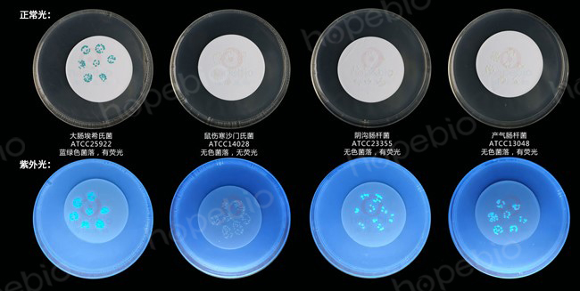 大肠杆菌产生的β-D-葡萄糖醛酸酶将显色剂吲哚氧基-β-D-葡萄糖醛酸(IBDG)切割成蓝色或靛蓝色化合物。大肠菌群产生的β-半乳糖苷酶可裂解氟化物4-甲基伞形酮-β-D-葡萄糖醛酸苷,生产4-甲基伞形酮,一种荧光化合物,当暴露于长波紫外线(366nm)时,可出现荧光反应。琼脂作为固化剂。
