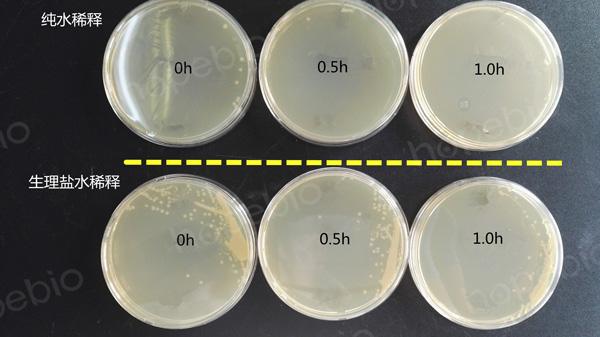 试验证明,用生理盐水制备的菌液,放置1h后菌数降低至初始状态的50%左右;而用纯水制备的菌液,放置1小时几乎无活菌。即使稀释后立即涂布,纯水悬液中的菌数也会迅速降至生理盐水稀释液中菌数的10%以下(如图2)。