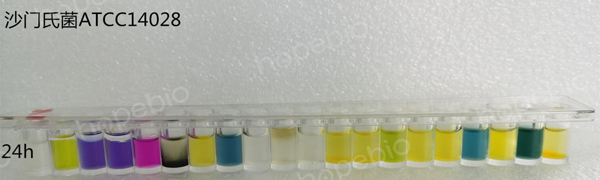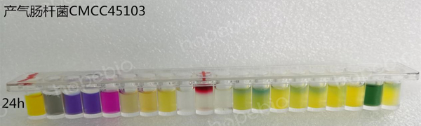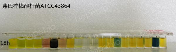 9孔为吲哚试验,有些细菌可分解色氨酸形成吲哚,加入二甲基苯甲醛(靛基质试剂盒)后反应生成玫瑰红色吲哚环,则为阳性反应,加入试剂后若颜色不变,则为阴性反应;
